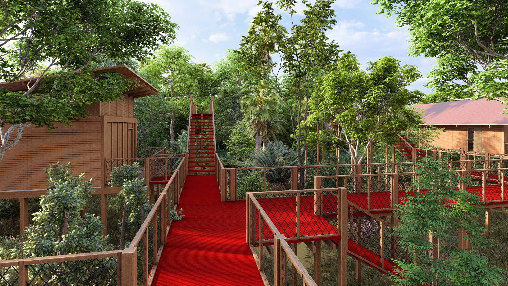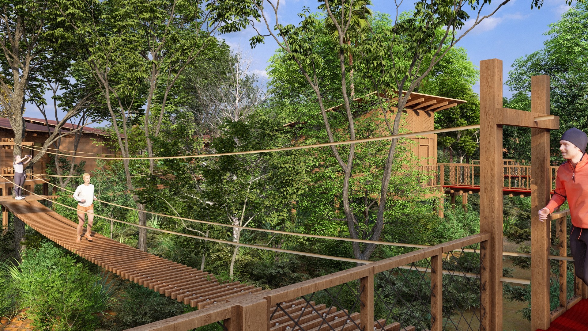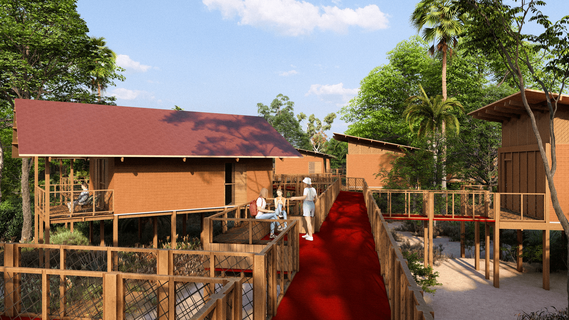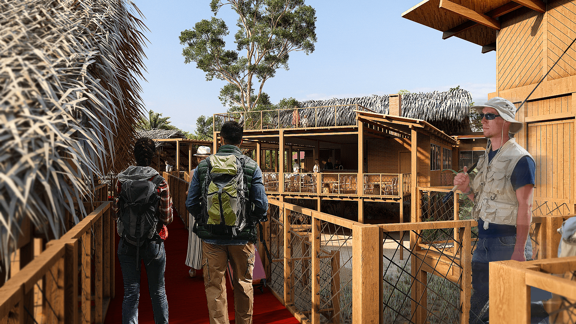 As estruturas do lodge foram pensadas para proporcionar conforto e imersão na natureza, com bangalôs que oferecem vista para a mata ou para o rio, varandas com redes e áreas de convivência.
