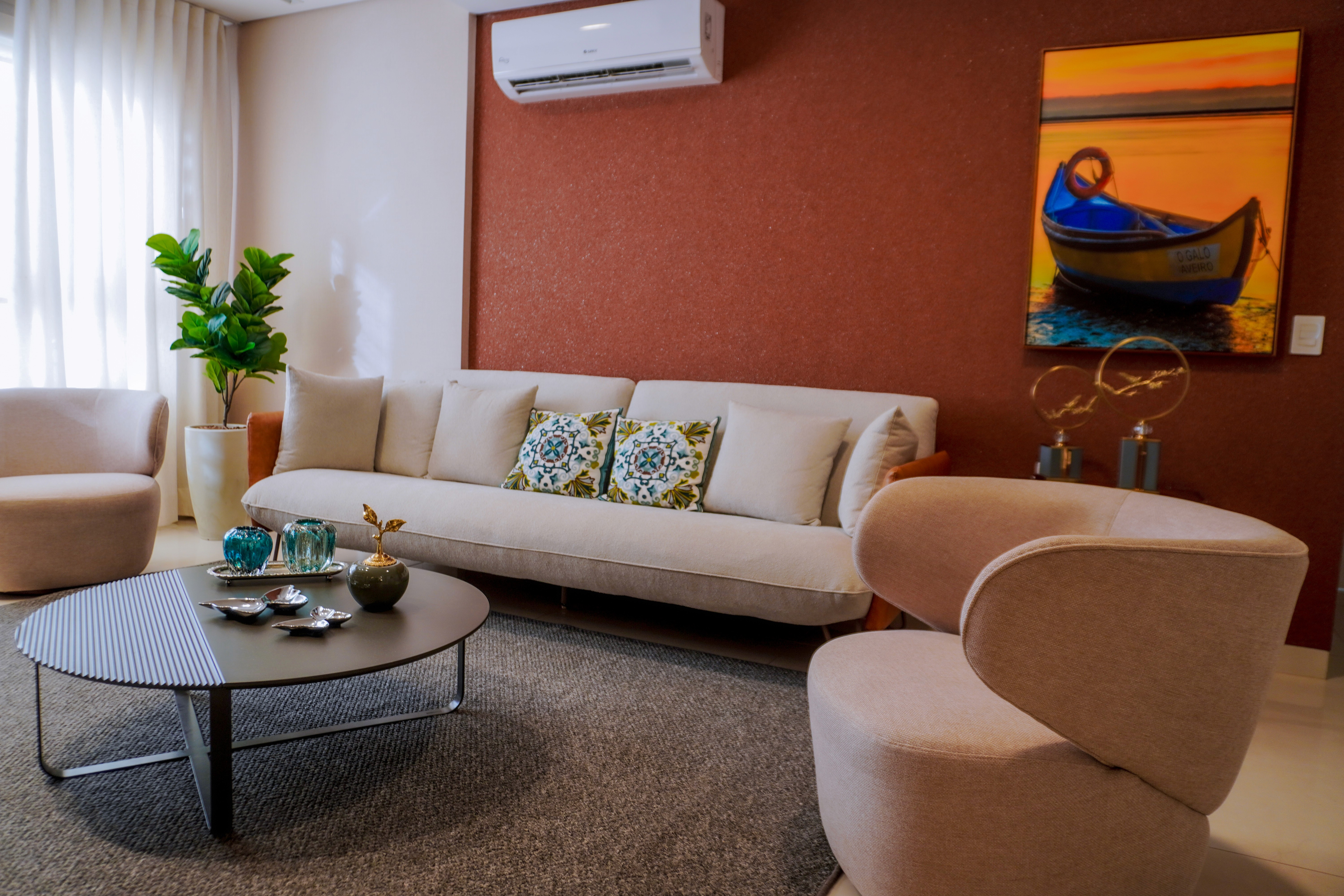 A paleta de cores neutras, combinada a texturas naturais e peças de design assinado, trouxe equilíbrio visual e conforto tátil. A disposição do mobiliário privilegia a convivência, com sofás amplos, iluminação cenográfica e integração fluida com o restante do apartamento.